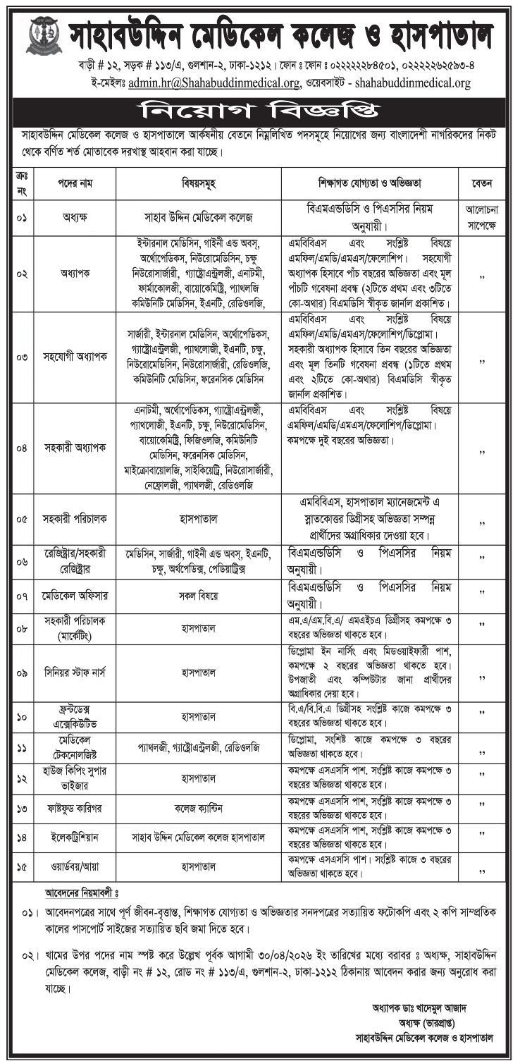 সাহাবউদ্দিন মেডিকেল কলেজ ও হাসপাতাল নিয়োগ ২০২৬ শিক্ষাগত যোগ্যতা ও অভিজ্ঞতা